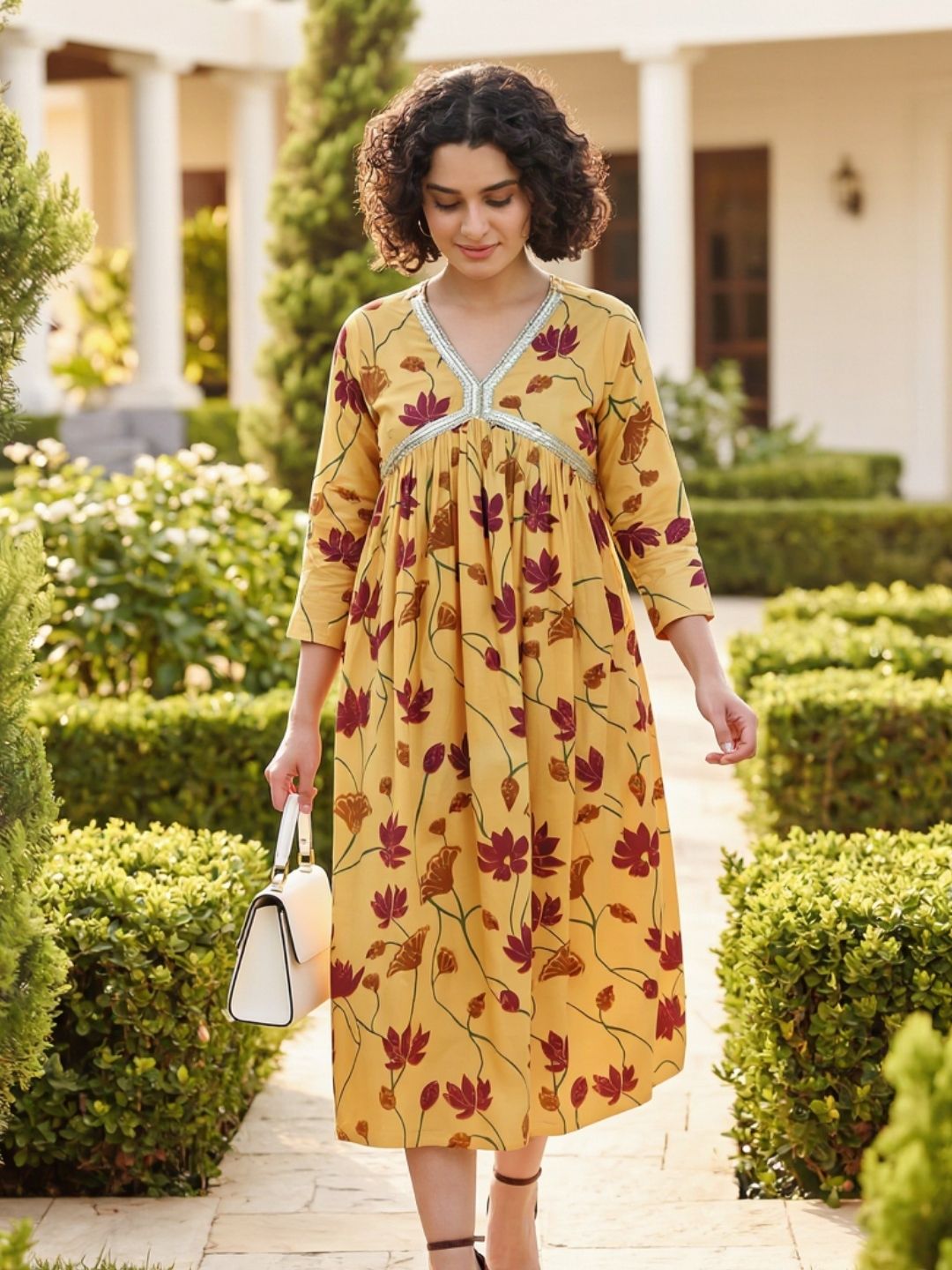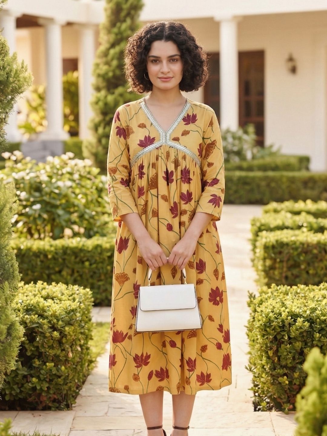 Experience timeless elegance with this handmade yellow dress, blending comfort and style effortlessly. The delicate floral print on a soft cotton blend fabric offers breathability, while the flared silhouette ensures a flattering fit. Perfect for casual, festive, or semi-formal occasions, it pairs easily with leggings, palazzos, or jeans. Designed for convenience, it’s machine-washable and retains its vibrant color and print long-term.