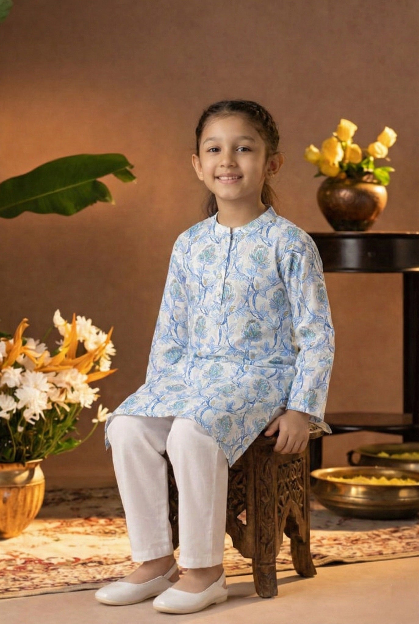 Classic Girls cotton kurta pyjama set, designed for comfort and style. This traditional outfit features a soft, breathable kurta paired with matching pyjama pants, perfect for festive occasions, family gatherings, or casual wear.
