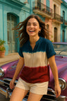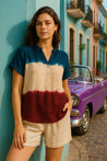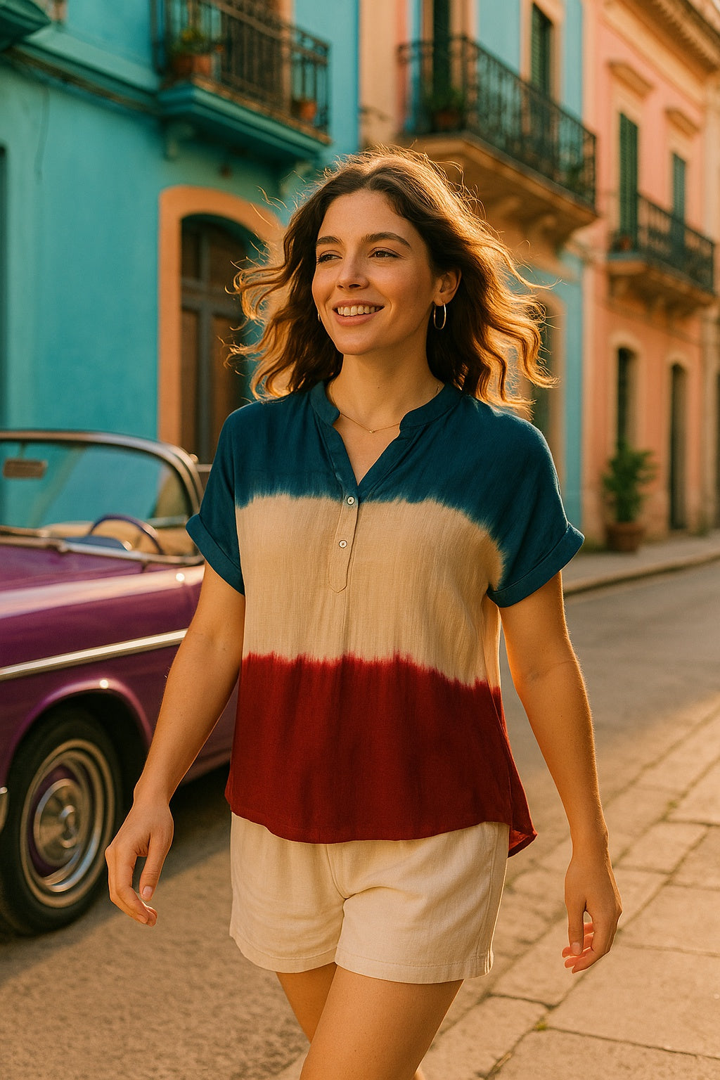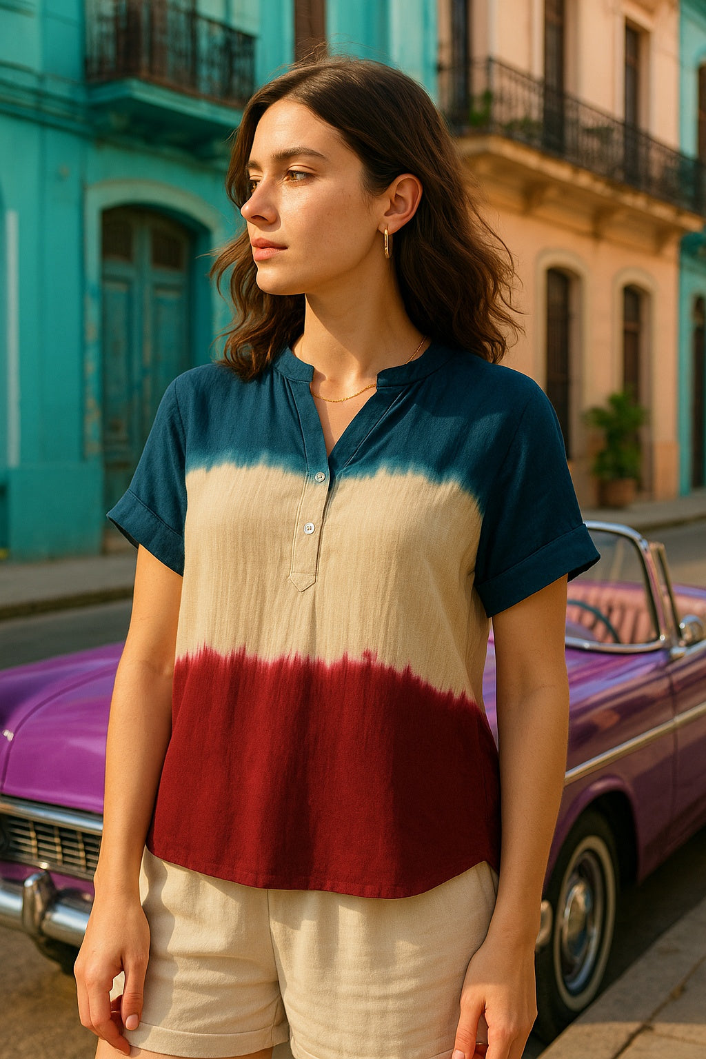 Introducing Our Tie-Dye Rayon Staple Top, a Vibrant and Unique Addition to Women's Clothing. Crafted from Soft, Luxurious Rayon Fabric, This Top Boasts a Captivating Tie-Dye Design That Is Further Enhanced by Charming Button Detailing, Making It a Truly Stylish Statement Piece.