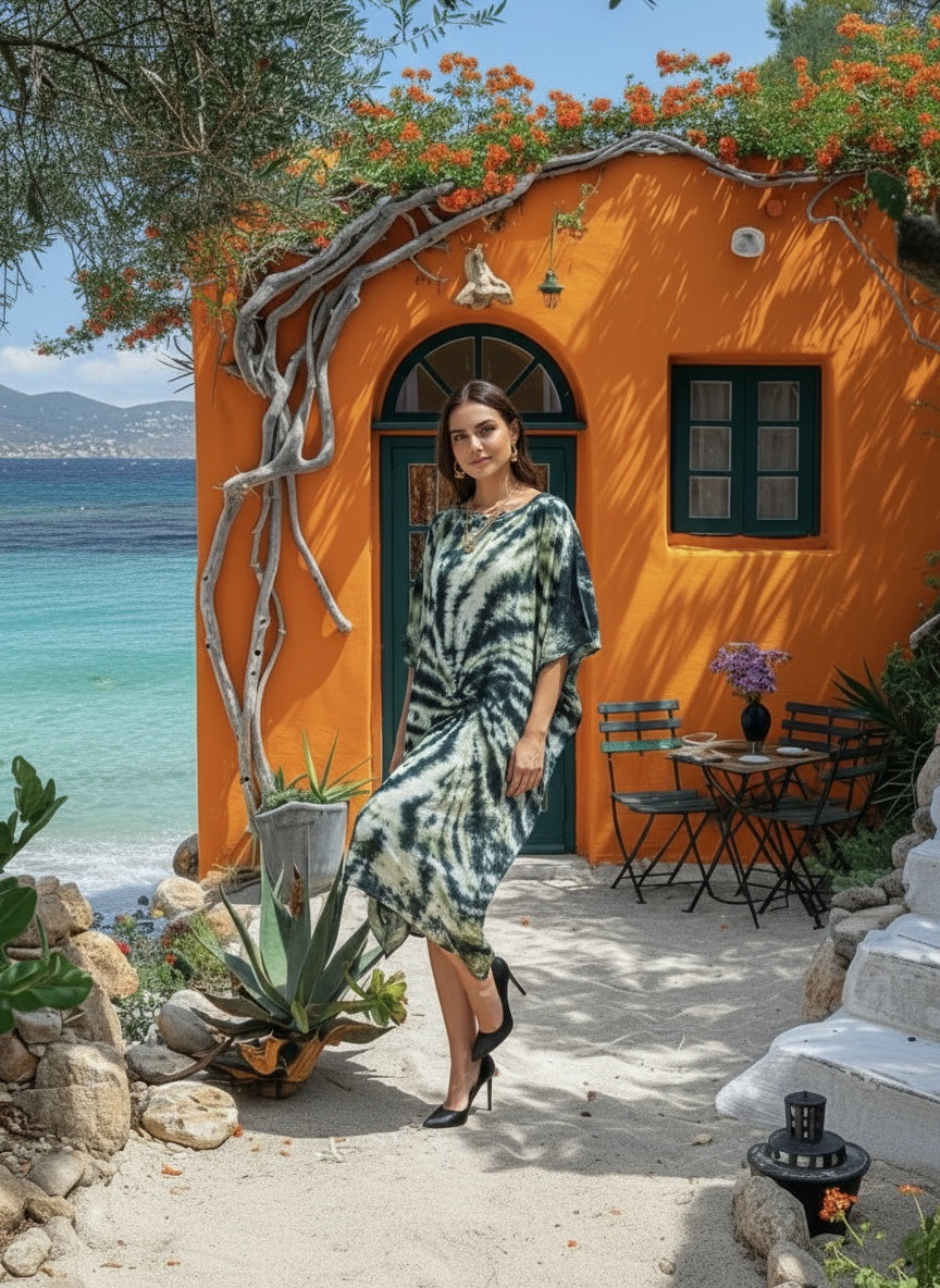 Women Hand Tie & Dyed Rayon Crepe Kaftan Dress (W1437)