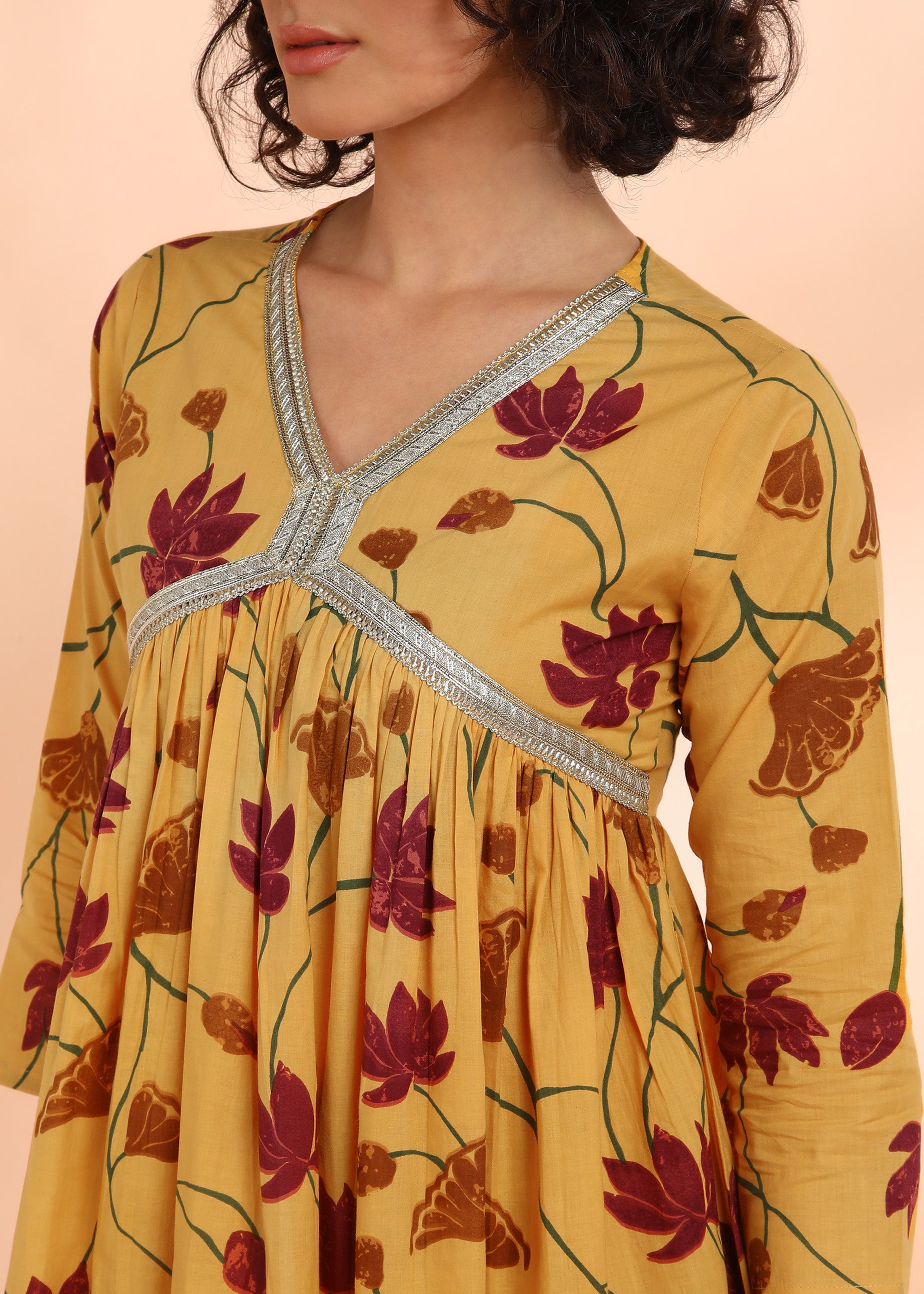 Experience timeless elegance with this handmade yellow dress, blending comfort and style effortlessly. The delicate floral print on a soft cotton blend fabric offers breathability, while the flared silhouette ensures a flattering fit. Perfect for casual, festive, or semi-formal occasions, it pairs easily with leggings, palazzos, or jeans. Designed for convenience, it’s machine-washable and retains its vibrant color and print long-term.