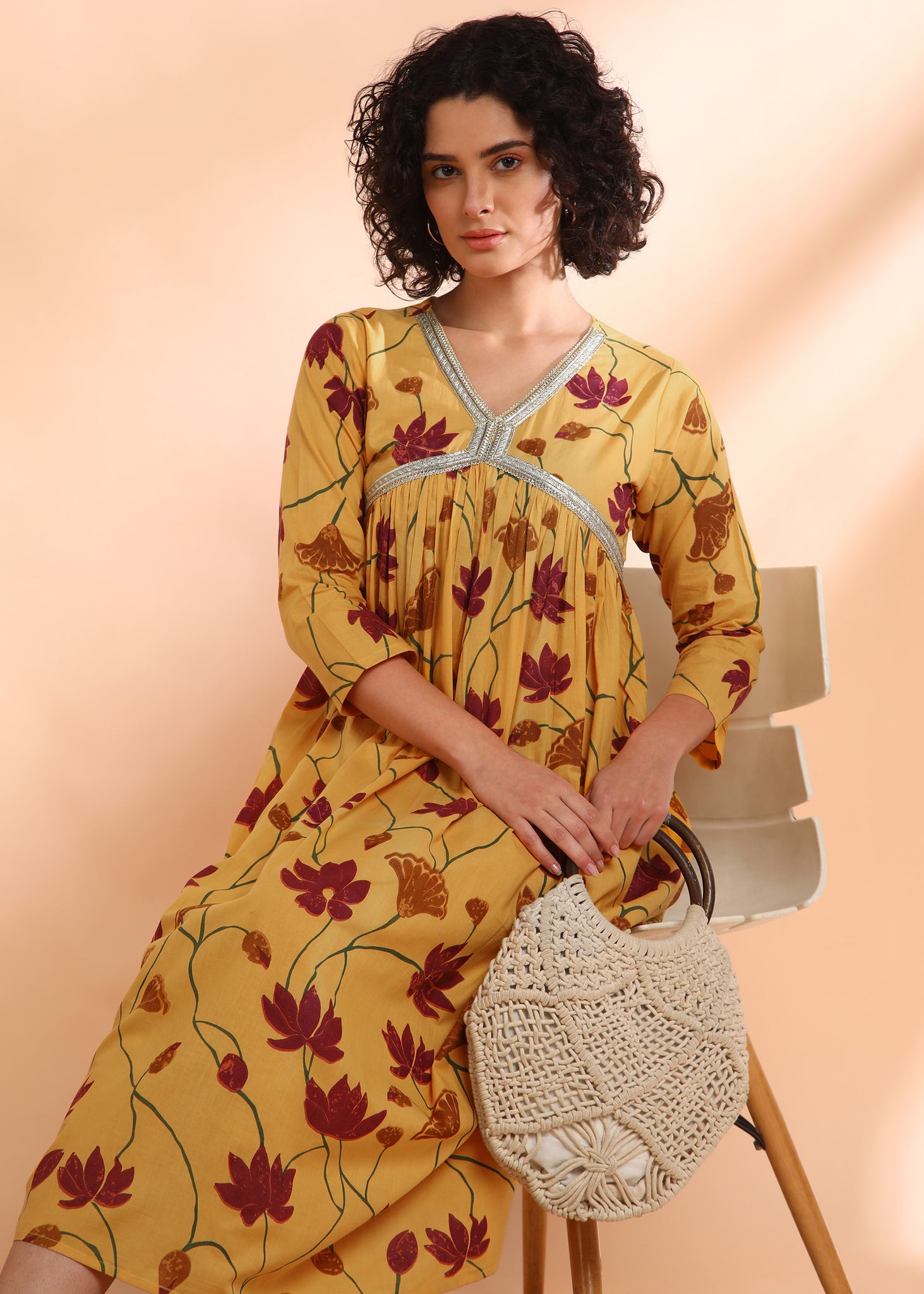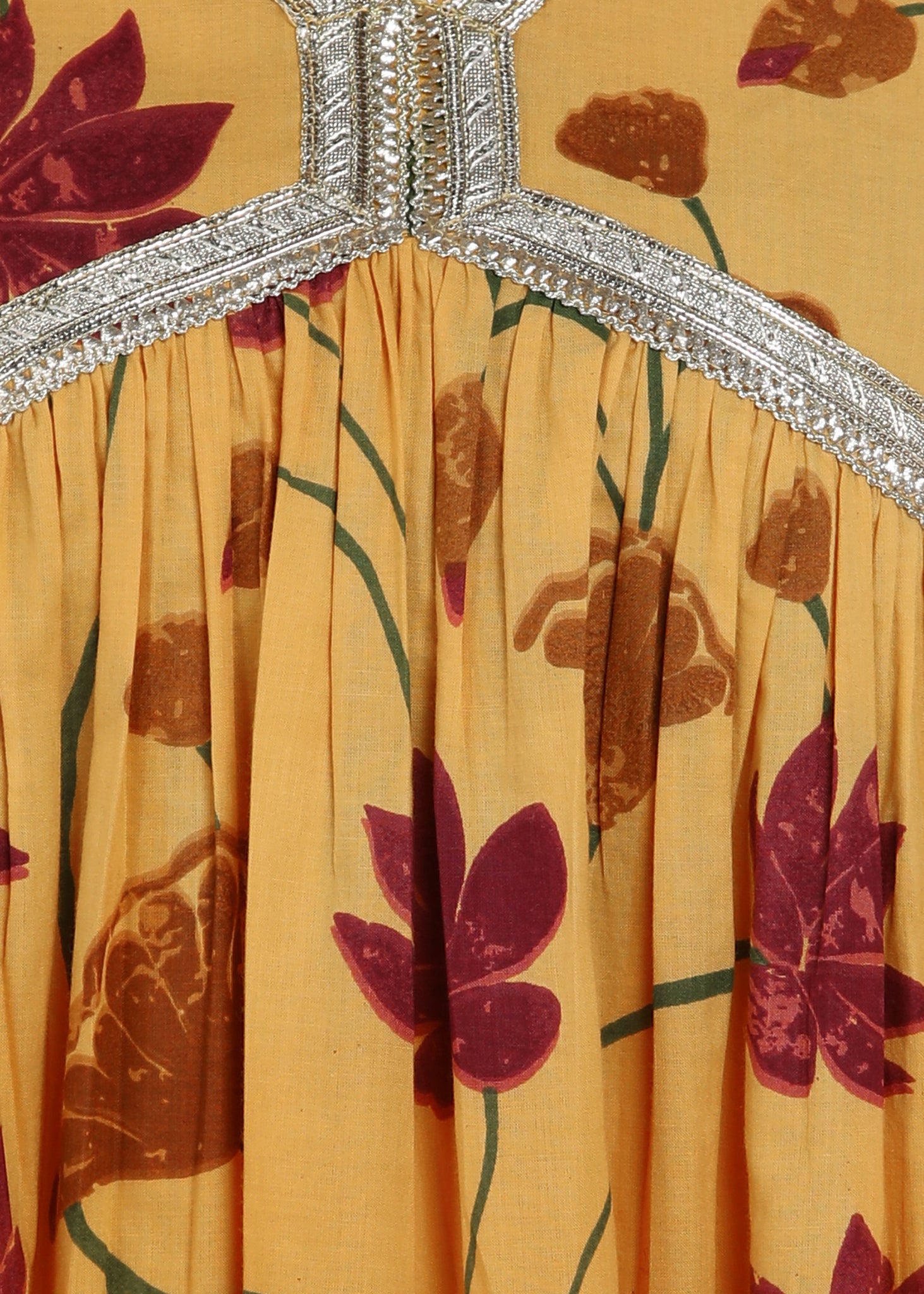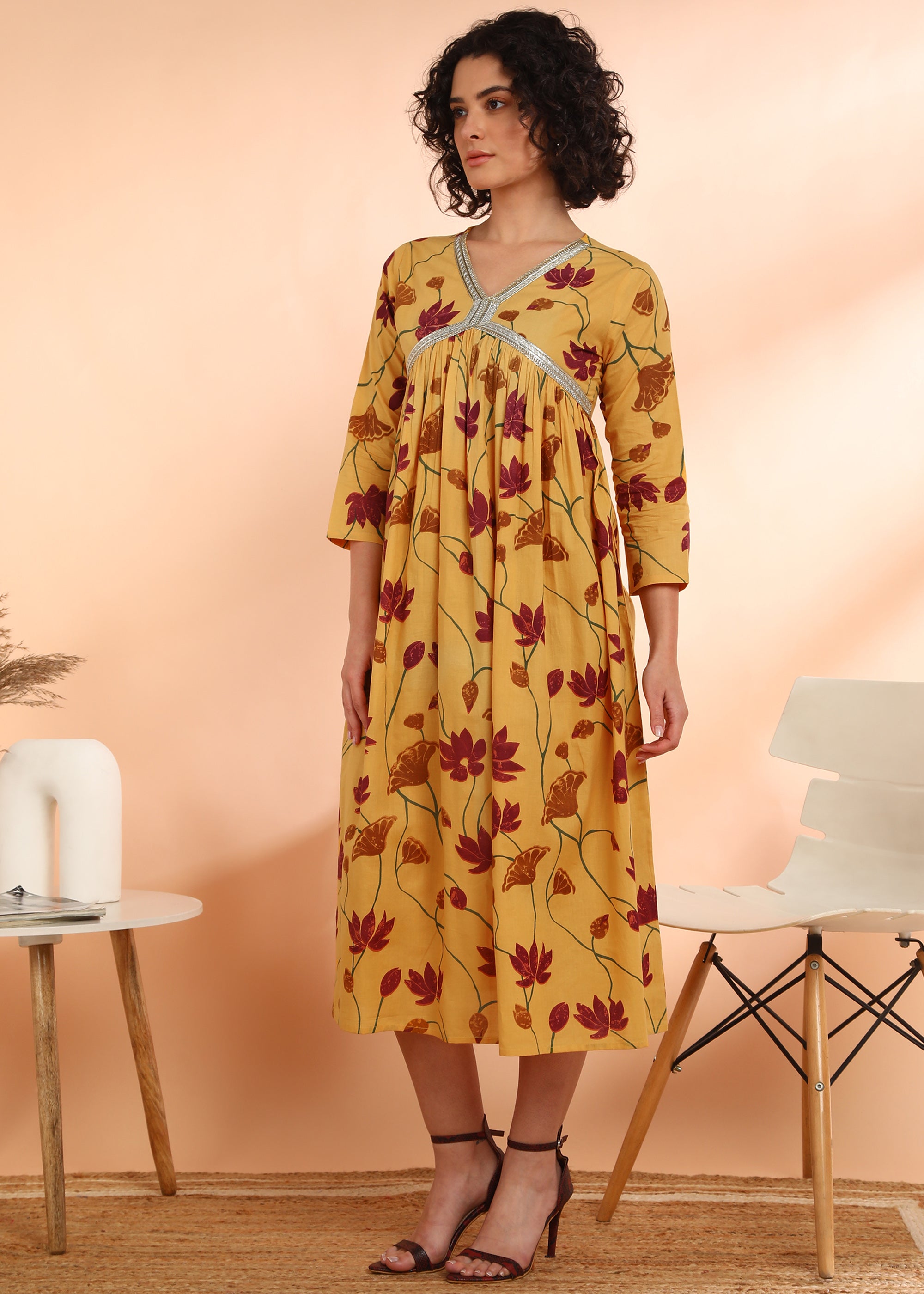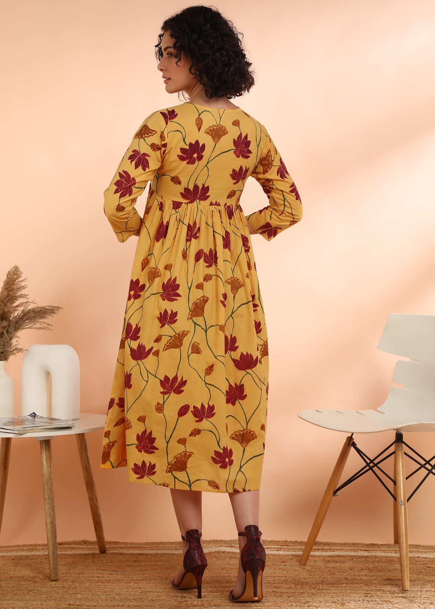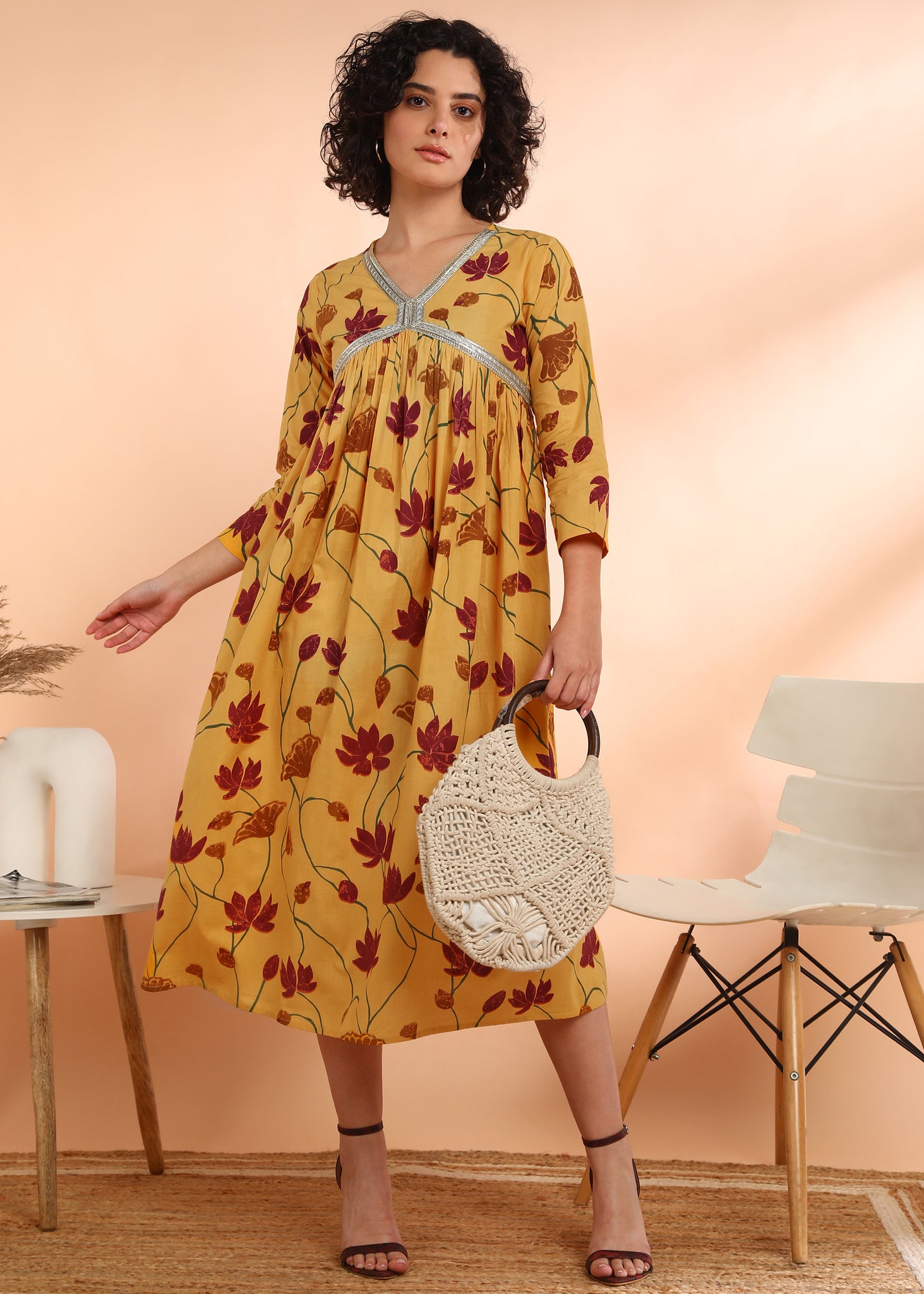 Women Handmade Floral Print Cotton Blend Flared Yellow Dress (W1593)